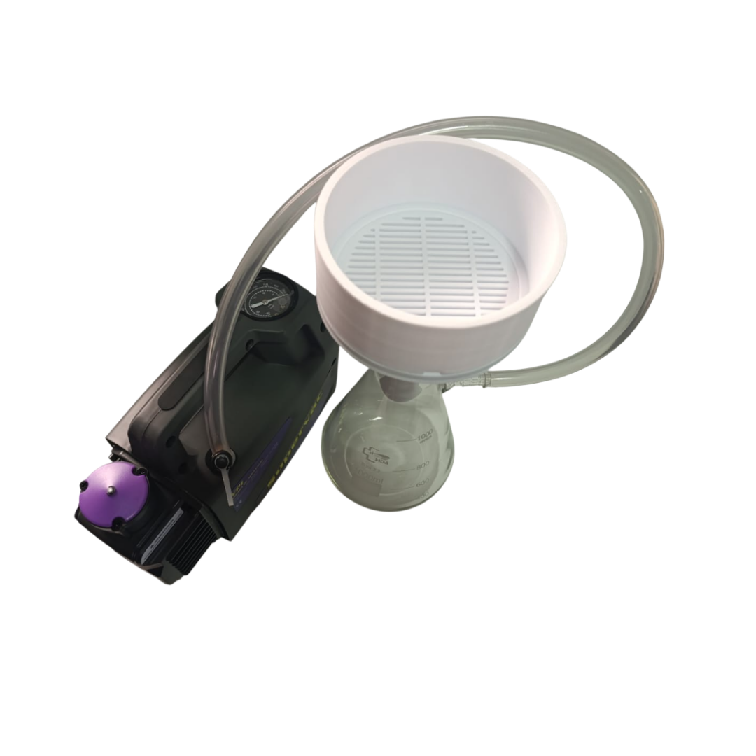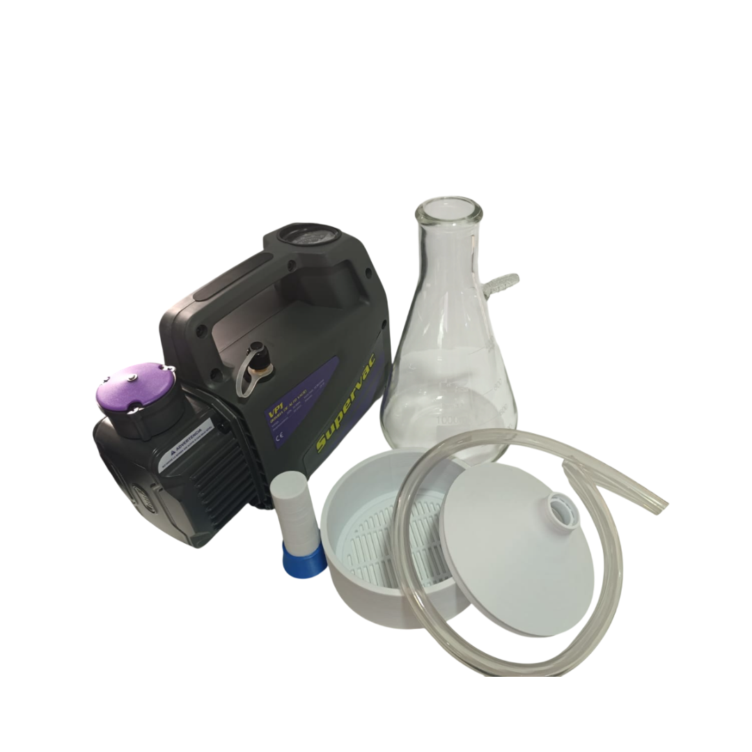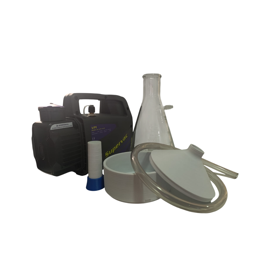 El kit incluye un Kitasato de vidrio de borosilicato de alta resistencia, diseñado para soportar presiones negativas sin riesgo de implosión, y un embudo compatible que asegura un sellado hermético. Para garantizar una puesta en marcha inmediata, el sistema se entrega con un set de filtros de porosidad específica y una manguera técnica reforzada con adaptadores universales, asegurando una conexión estanca y sin fugas.