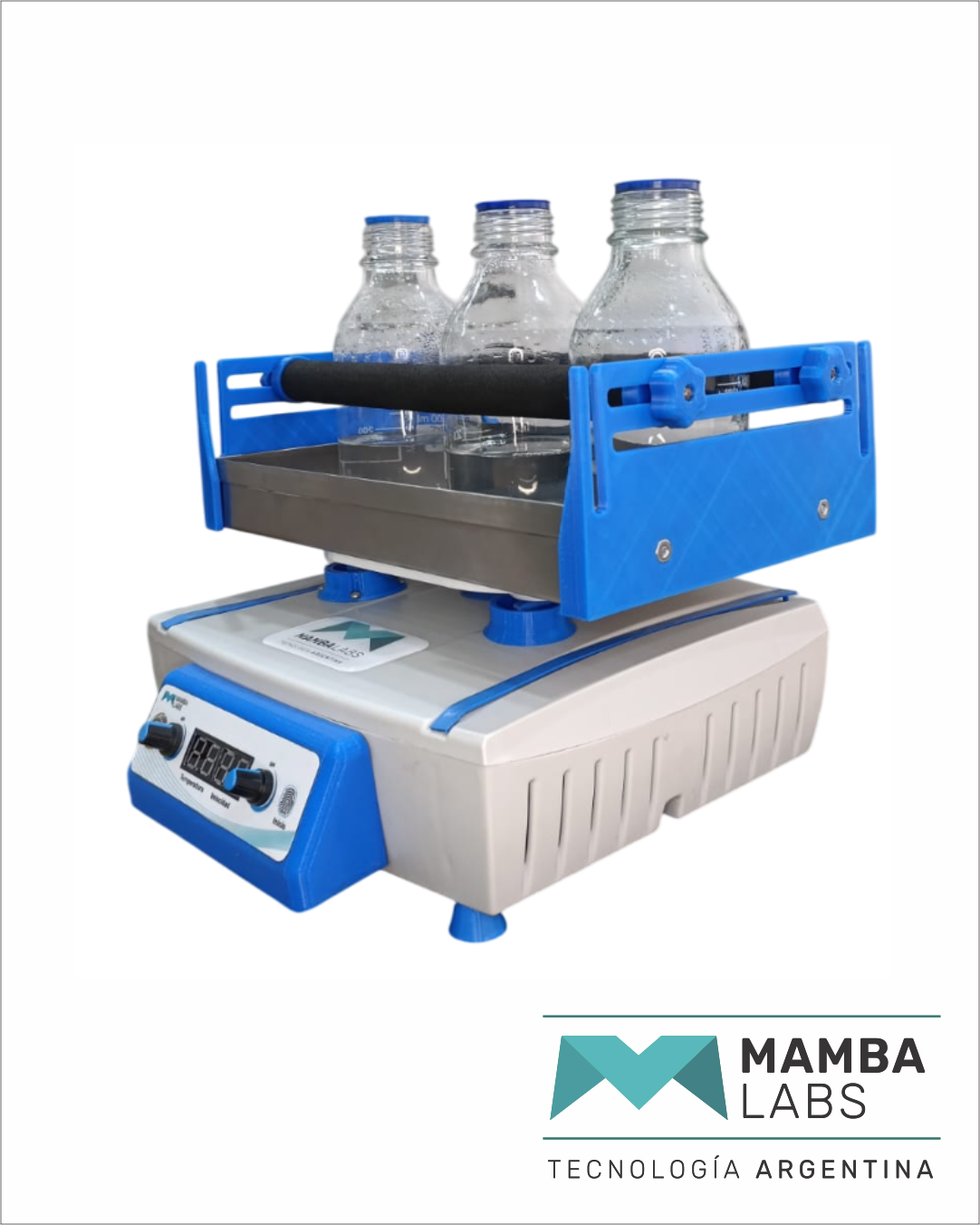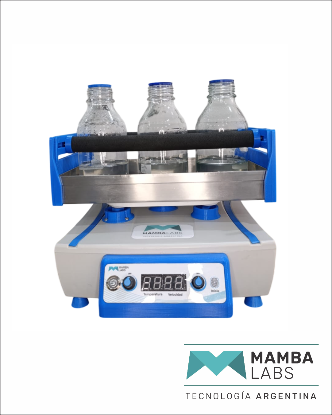 Velocidad de agitación de 0 a 200 rpm y temperatura seteable hasta los 60°C.
